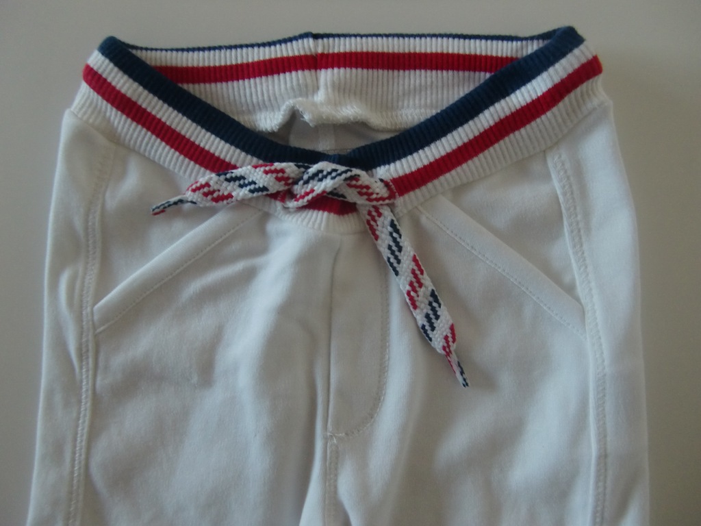 Coole Sweathose von Ducky Beau in weiss, aus knuffig weicher Sweatware, Gummizugbund mit Tunnelzug, zwei Eingrifftaschen, zwei Seitentaschen, die Rippbündchen haben rote und blaue Streifen.