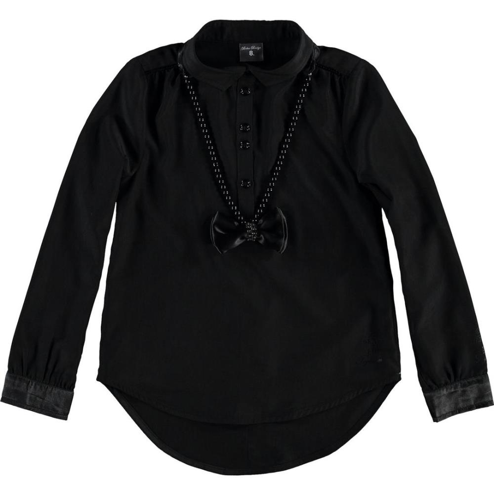Elegante Bluse von Baker Bridge in schwarz, schöner Schnitt, hinten länger geschnitten, vorne mit halber Knopfleiste, Bubikragen - tolles Highlight ist die dazugehörige Perlenkette mit Schleife und Strasssteinen zum binden.