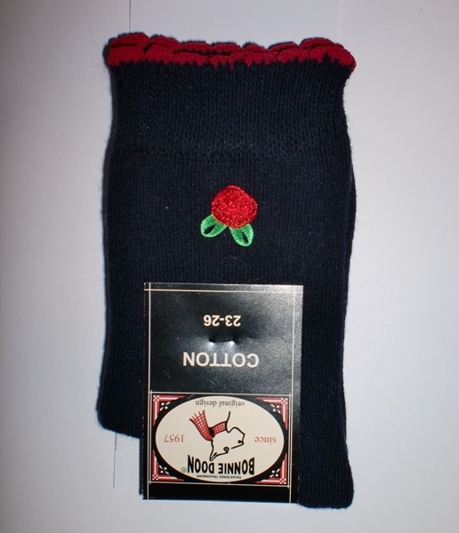Wunderschöne Bonnie Doon Socken in navy mit rotem Satin-Röschen und roter Abschlusskante.