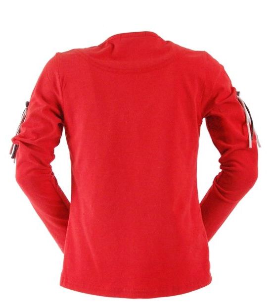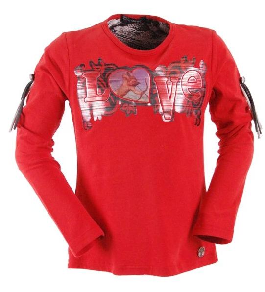 Hammer Langarm-Shirt/Longsleeve von Carbone mit großem glänzendem Love-Print, rot, Rundhalsausschnitt und abnehmbaren Bändern am Oberarm.
