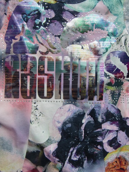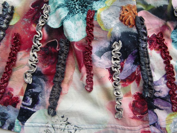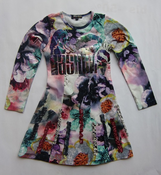 Wunderschönes Carbone Kleid aus Stretch-Jersey mit Flowerprint, paspelierter Rund-Halsausschnitt, Vorder- und Rückenteil mit Wiener Nähen, Glockenform-Rockteil, Filmdruck im Brustbereich mit kleinen Similisteinchen umraht, Rockteil ist rundherum mit Rüschen verziert. 3/4-lange Ärmel und Rockabschluss sind gesäumt.
