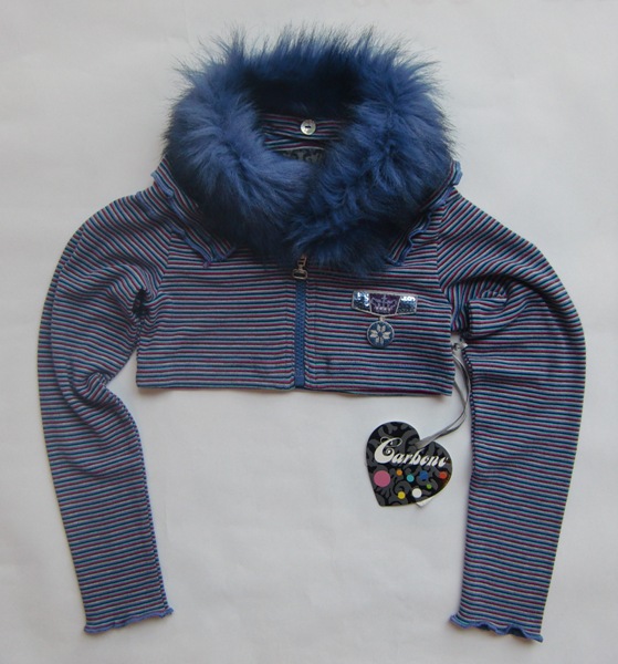 Carbone Kurz-Cardigan /Jacke im Streifen-Look schwarz-bunt, mit Fellkragen, mit geteiltem Reissverschluss. Die perfekte Ergänzung zu allen Oberteilen dieser Serie.