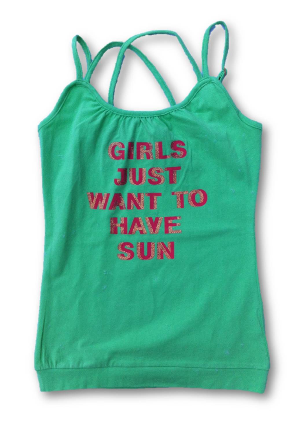 Tolles Top von CKS in grün mit glitzer Schrift-Print, jeweils zwei verstellbare Spagetti-Träger von denen sich immer ein Träger am Rücken kreuzt.