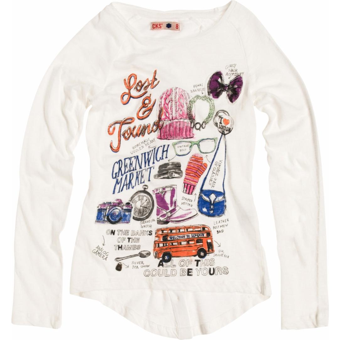 Klasse Langarm-Shirt/Longsleeve von CKS mal etwas anders. Das Rückenteil ist länger die Farbe ist claud cream, es hat ein großes Front-Print und einen Rundhals-Ausschnitt.