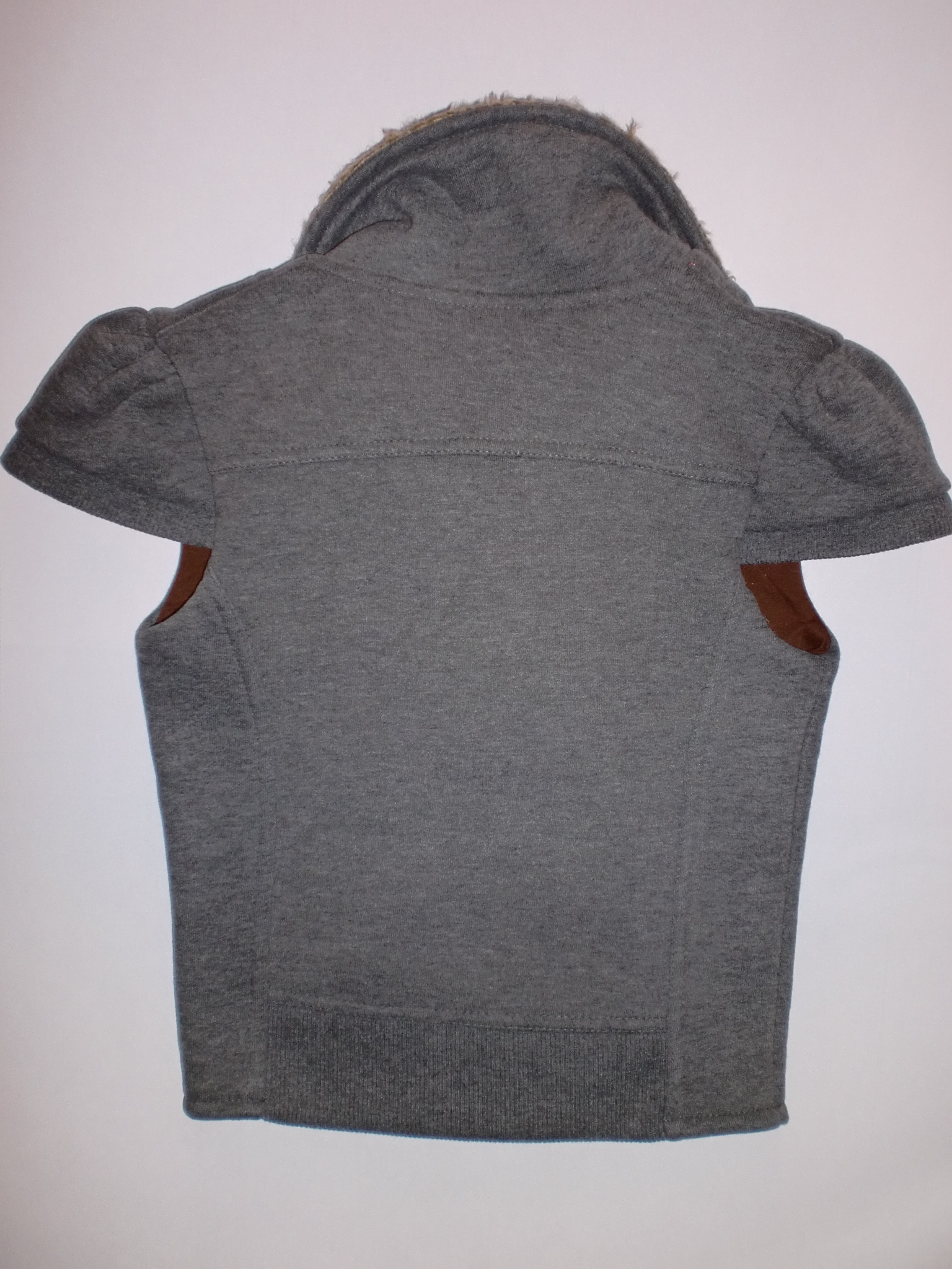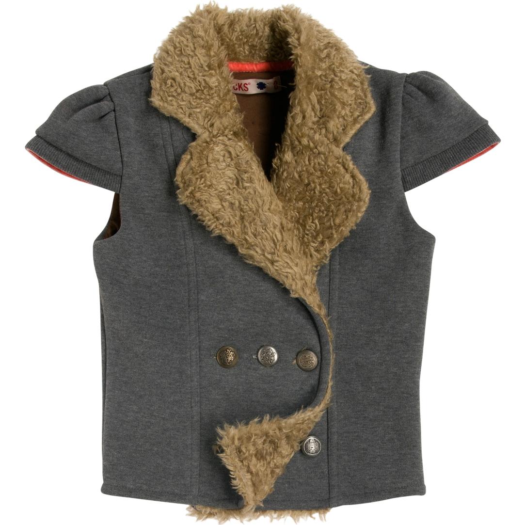 Klasse Sweat-Cardigan/Weste von CKS in dunkel grau mele, mit Knöpfen zu schließen, am Kragen und an der Knopfleiste mit Fellbesatz, Puff-Ärmelchen. Auf der Rückseite unten ist ein Bündchenstoff eingesetzt - Super.