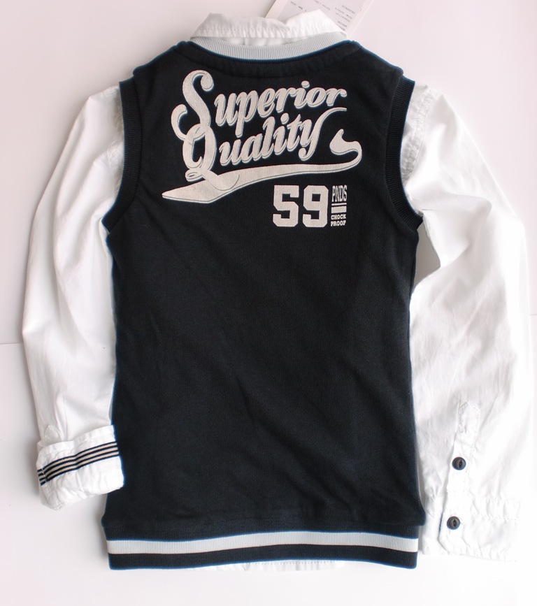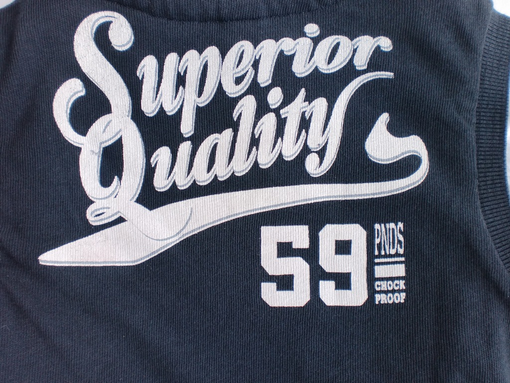 Trendiger Feinstrick Pullunder von CKS in graphite/weiss, mit V-Ausschnitt; Vorderseite mit Brustprint und Applikation; großer Rückenprint.