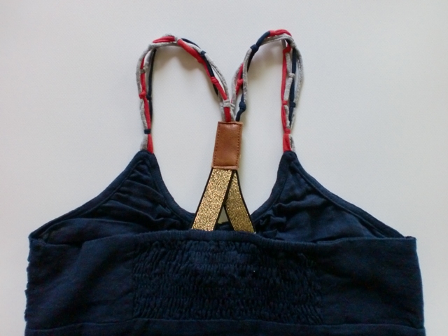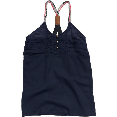 Hübsches Top von CKS für Mädels in blazer navy, mehrfarbige Träger, drei wunderschöne Perlenknöpfe und schöne Raffungen im Brustbereich; der Rücken ist im Racerback-Style (wie Hosenträger)