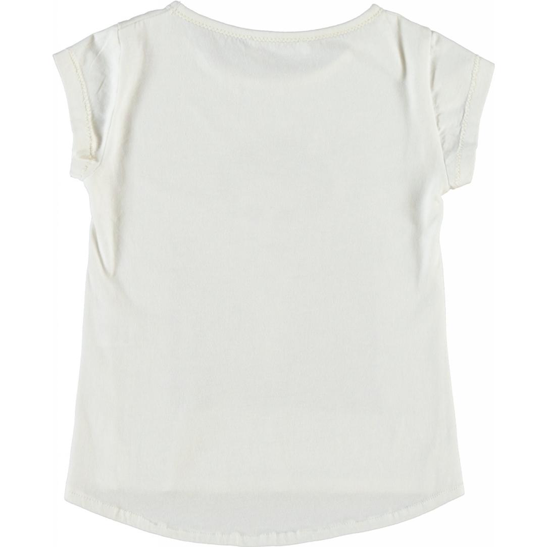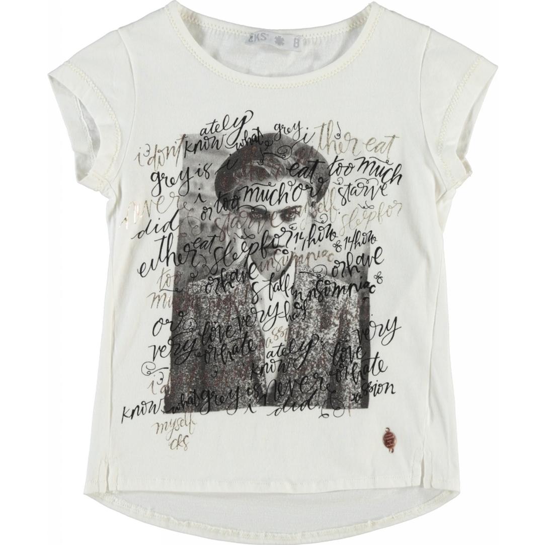 Sehr schönes T-Shirt von CKS in pearl white mit Photo-Print und darüber ein mixed aus glitzer und schwarzem Schrift-Print, am Bund seitlich mit kleinen Schlitzen.