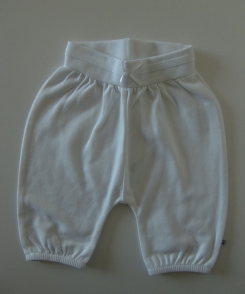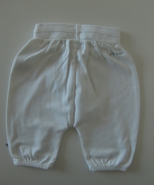 Weiße Pluderhose / Haremshose aus weichem Jersey, mit elastischem Bund mit Satin-Schleife, elastisch geraffter Saumabschluss an den Beinen. Auf der Rückseite ist das Ducky Beau-Logo in hellgrau eingestickt.