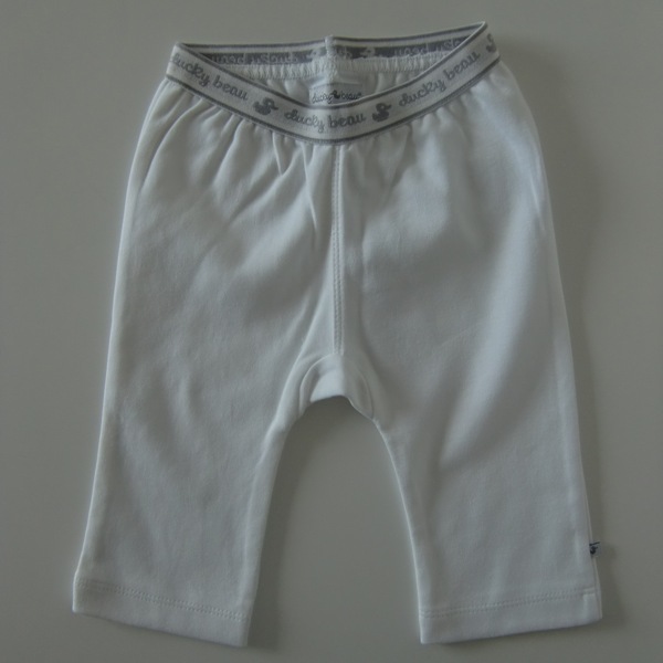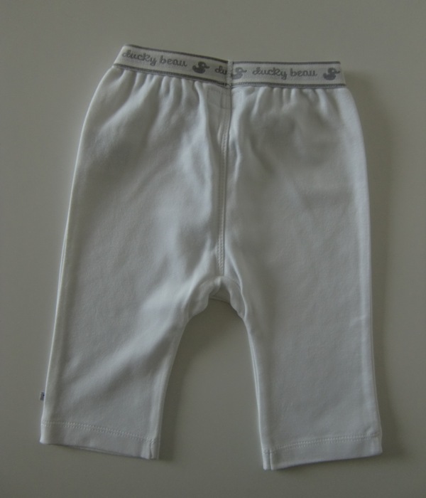 Weiße Hose von Ducky Beau aus weichem Jersey, mit elastischem Bund mit Ducky Beau-Logo in grau.