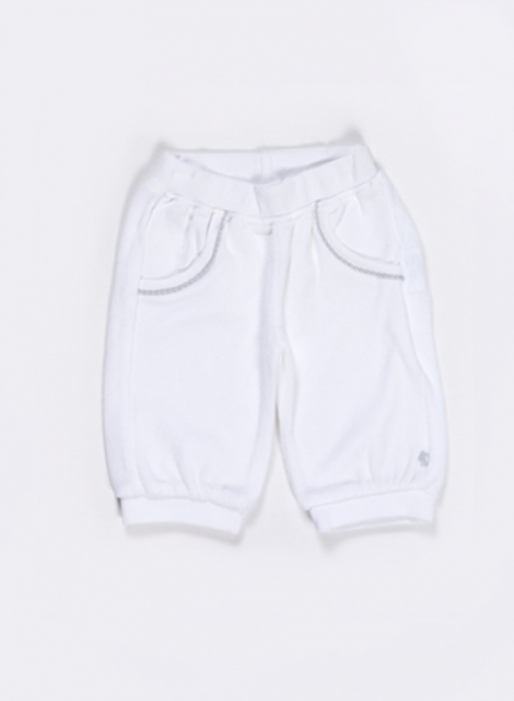 Sehr weiche Nicky-Hose in weiß mit einem feinen grauen Rand an den Taschen. Mit elastischem Bund. Die Beine haben elastische Bündchen.