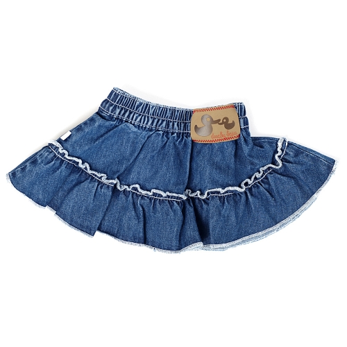 Entzückender, weicher Jeans Rüschen-Rock, abgesetzte Kontrastnähte, Bundweite regulierbar, vielseitig zu kombinieren.