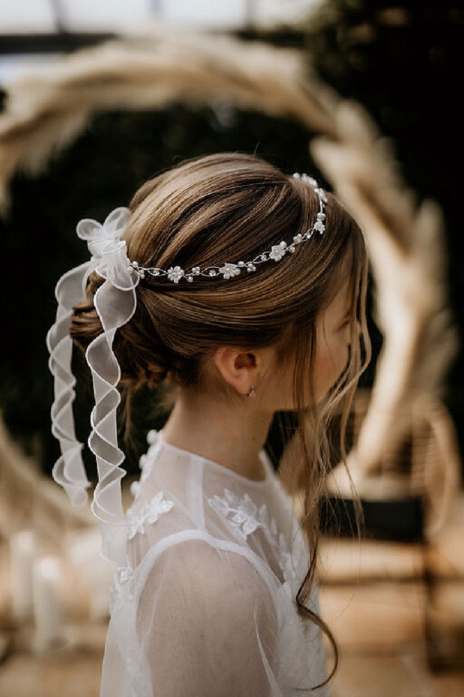 Exklusiver Haarschmuck mit Blüten und Organza-Bändern in ivory.