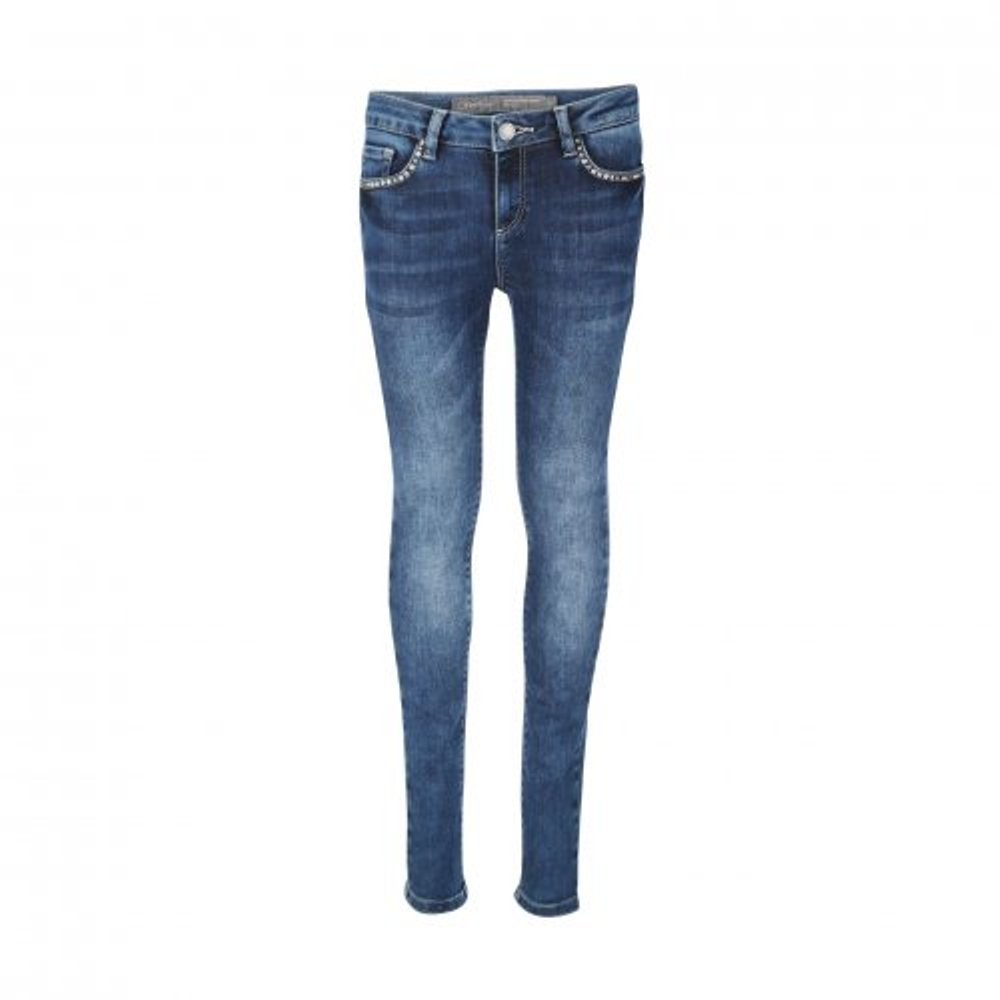 Super Skinny Jeans von Geisha in blue denim mit einer schönen Waschung, die vorderen Taschen sind mit Nieten geschmückt, 5-Pocket-Style, Bund innen verstellbar, Gürtelschlaufen.