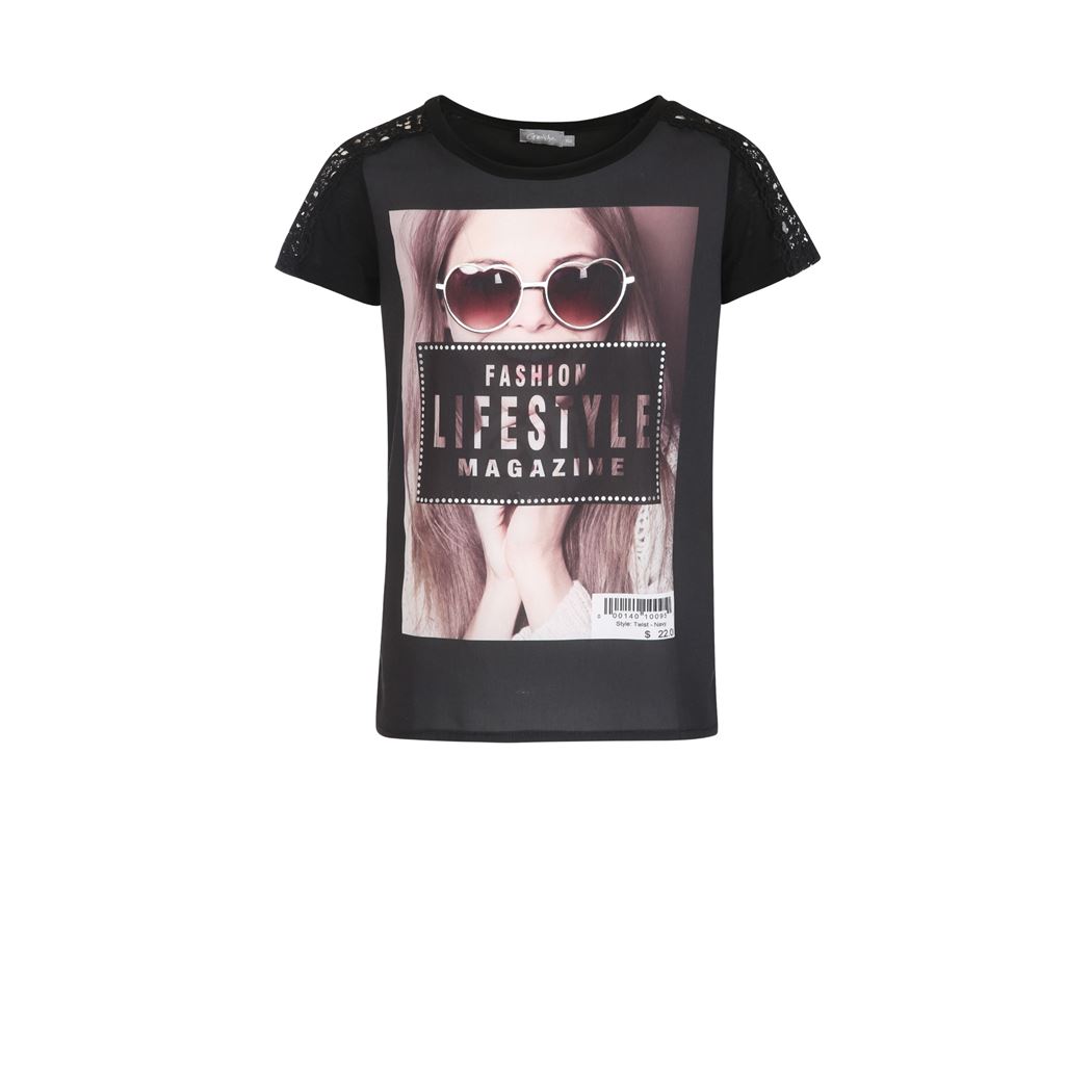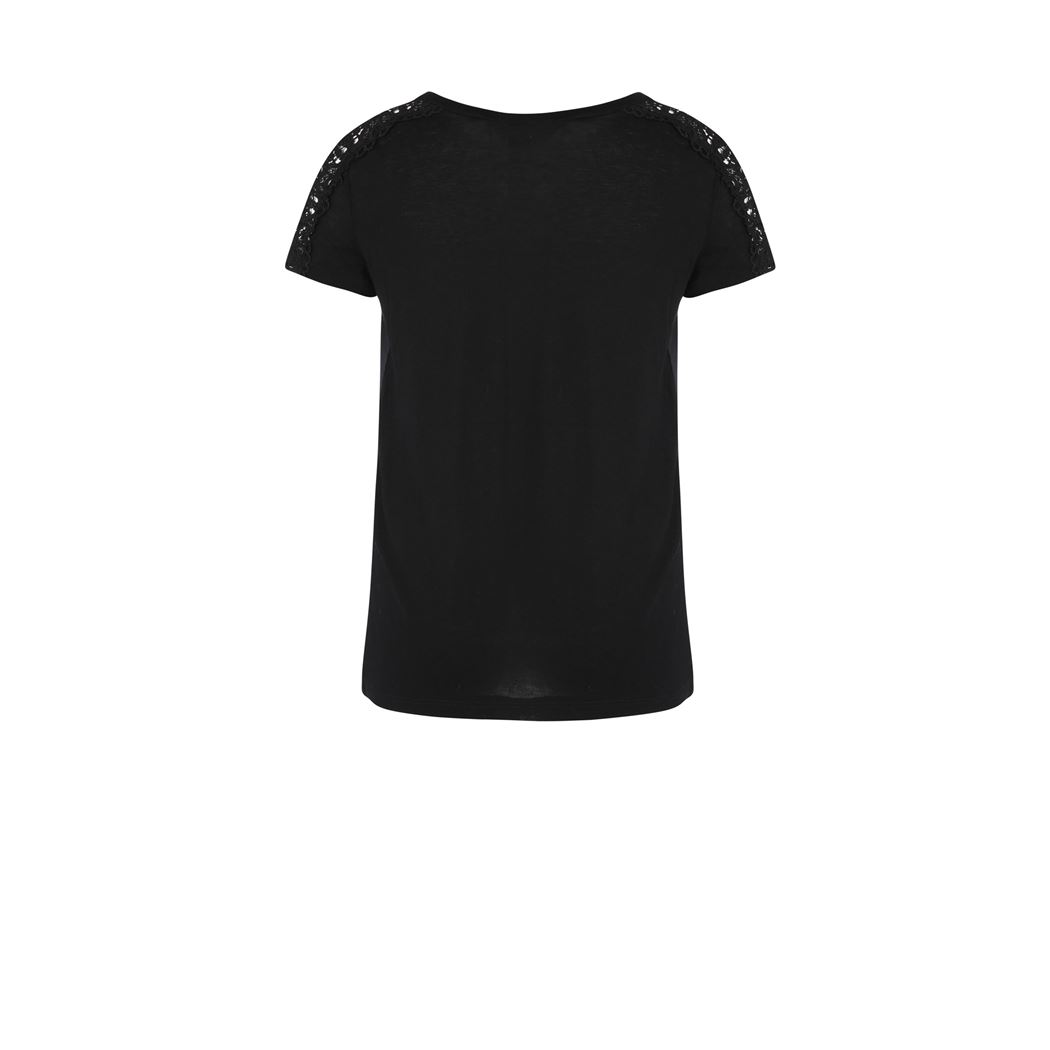 Trendiges T-Shirt von Geisha in schwarz mit Spitzeneinsatz an den Schultern, mit Front-Print, Materialmix.