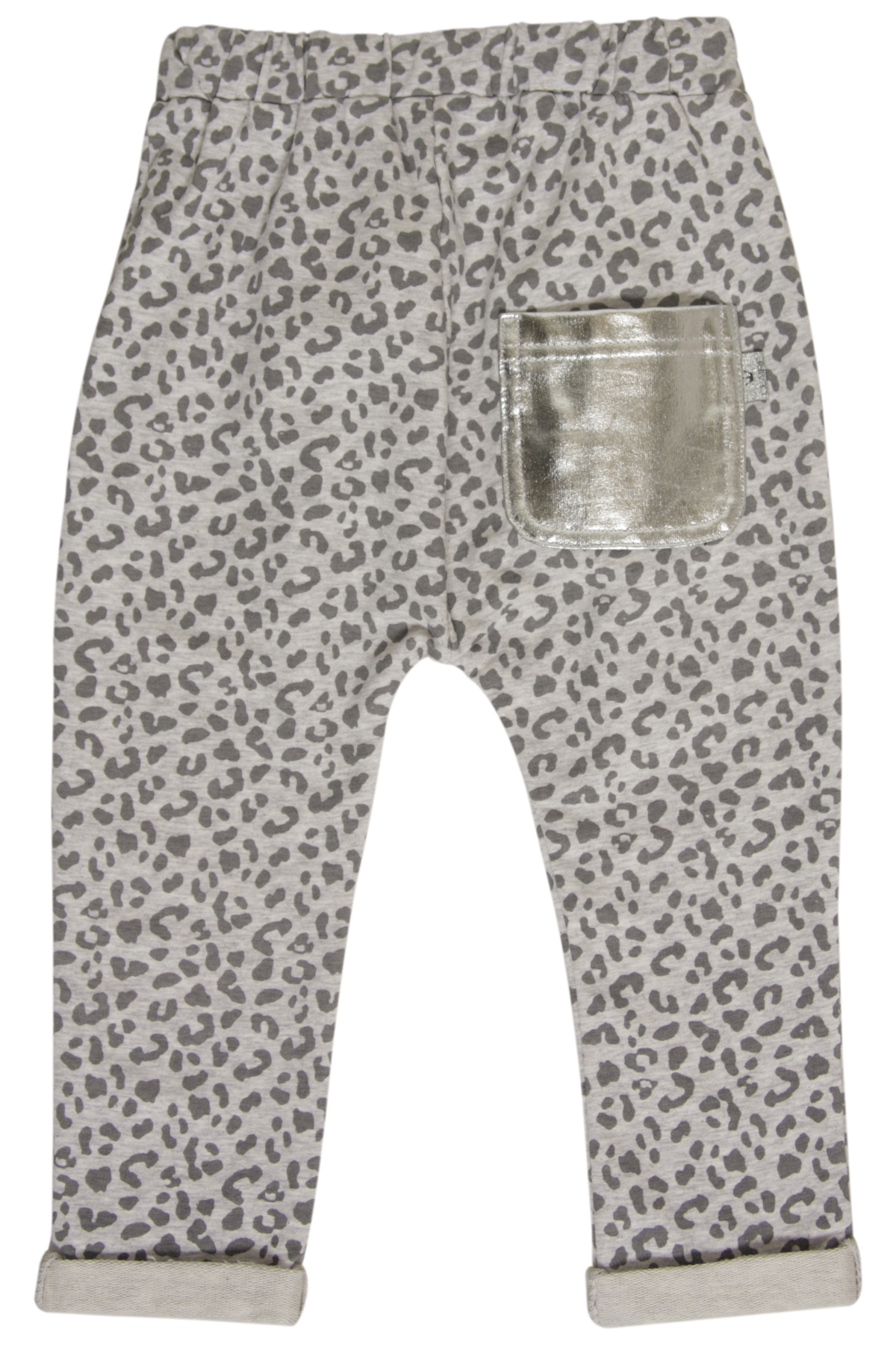 Hammer Sweat-Hose von Hust & Claire in pearl grey melange, im Geparden-Look, mit einer silbernen Popo-Tasche. Die Hose hat einen Gummizugbund, innen weitenregulierbar.