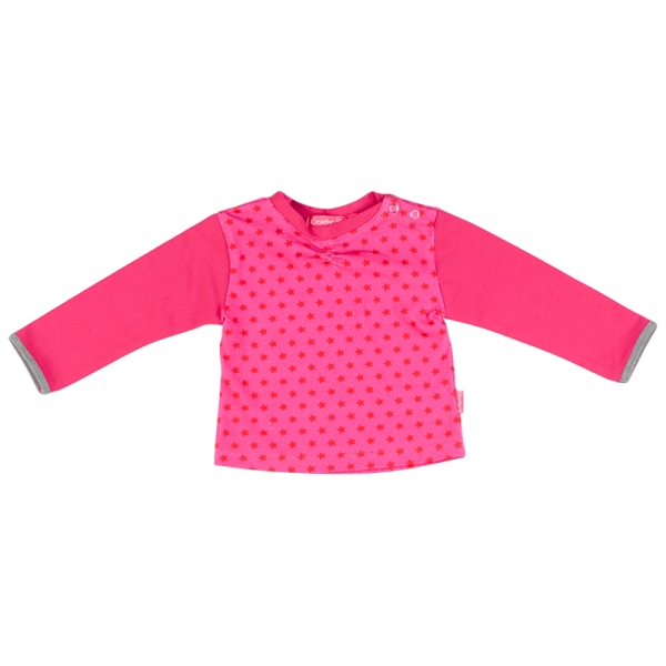 Supersüßes Langarm-Shirt/Longsleeve von Kiezel-tje Mini in pink mit Sternen allover, die Ärmel sind unifarben, vorne am Ausschnitt mit kleiner Raffung - zwei Druckknöpfe an der Schulter.
