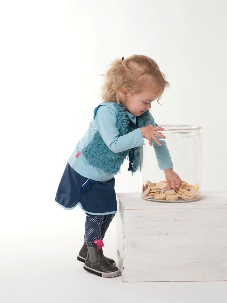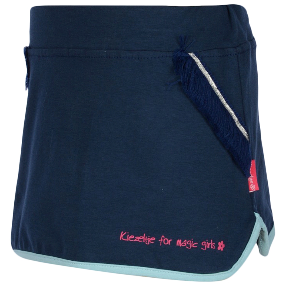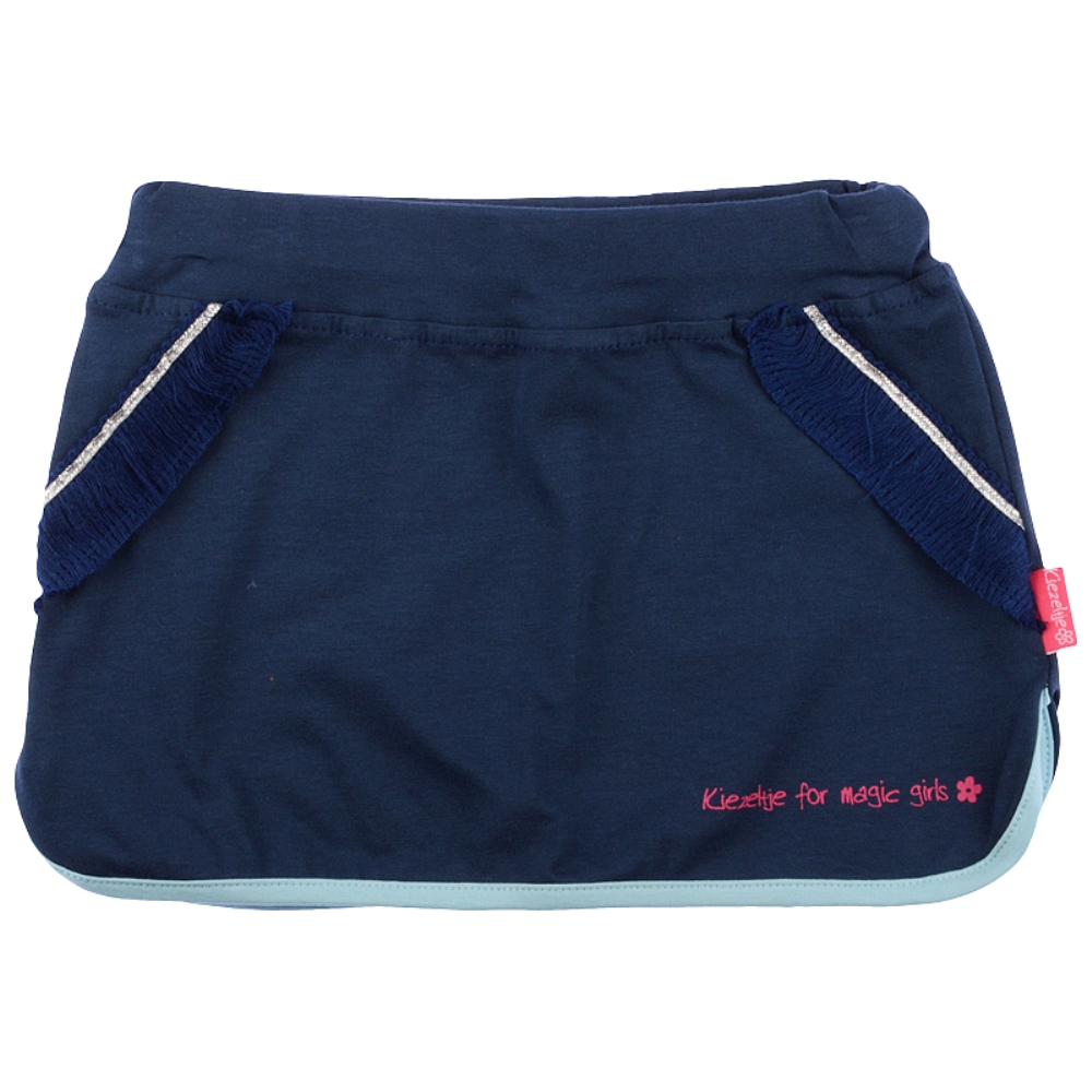 Zauberhafter Rock von Kiezel-tje Mini in blau, vorne mit zwei Eingriff-Taschen die mit Fransen verziert sind, der Bund unten ist nicht gerade sondern seitlich ähnlich einem kleinen Schlitz rund nach oben geschnitten, Gummizugbund. Super schön und super bequem!