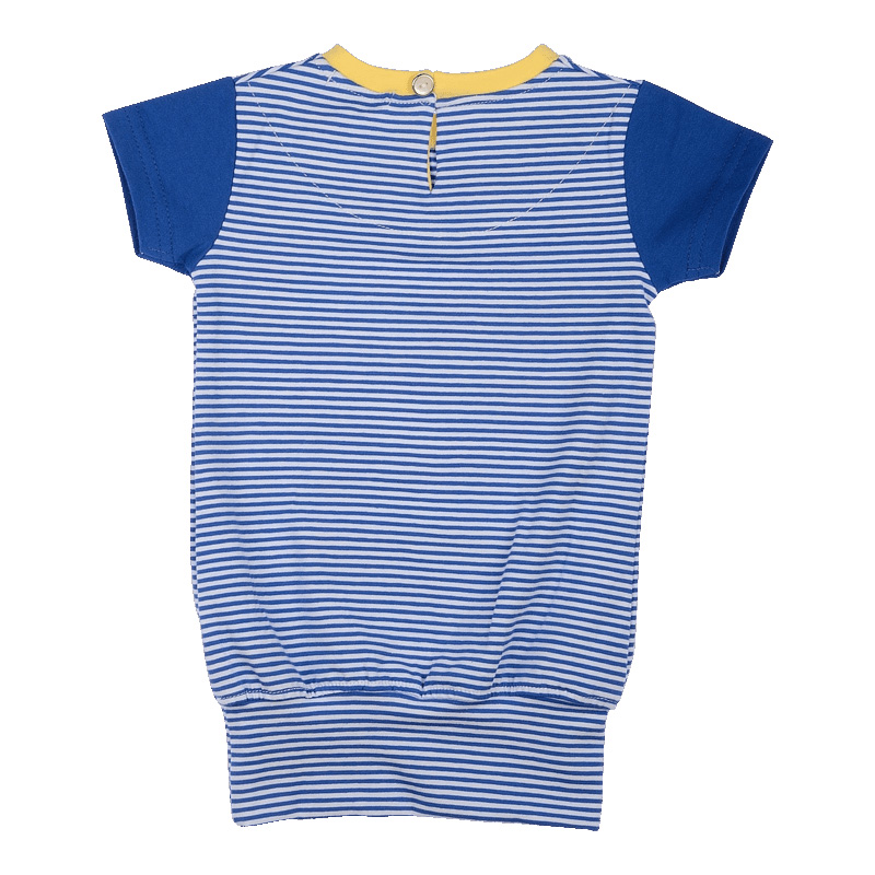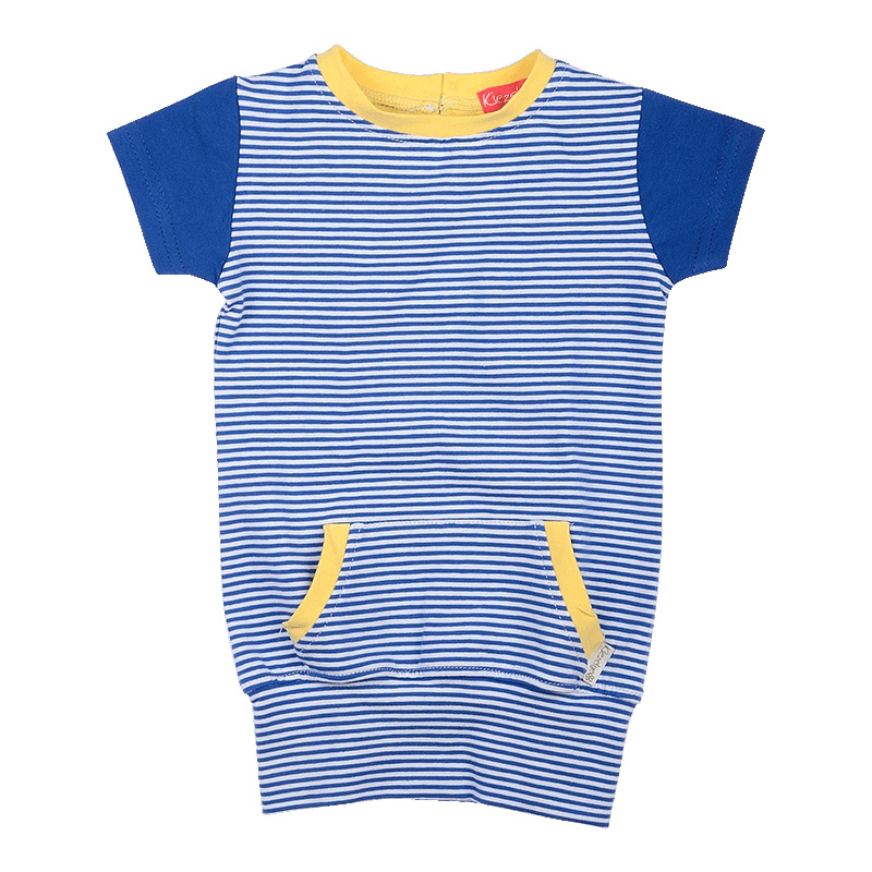 Freches Kleidchen von Kiezel-tje Mini im Streifen-Look. Die Ärmelchen sind uni blau, vorne mt Kangurutasche - am Rücken sorgt ein Knopf für ein leichtes An-und Ausziehen.