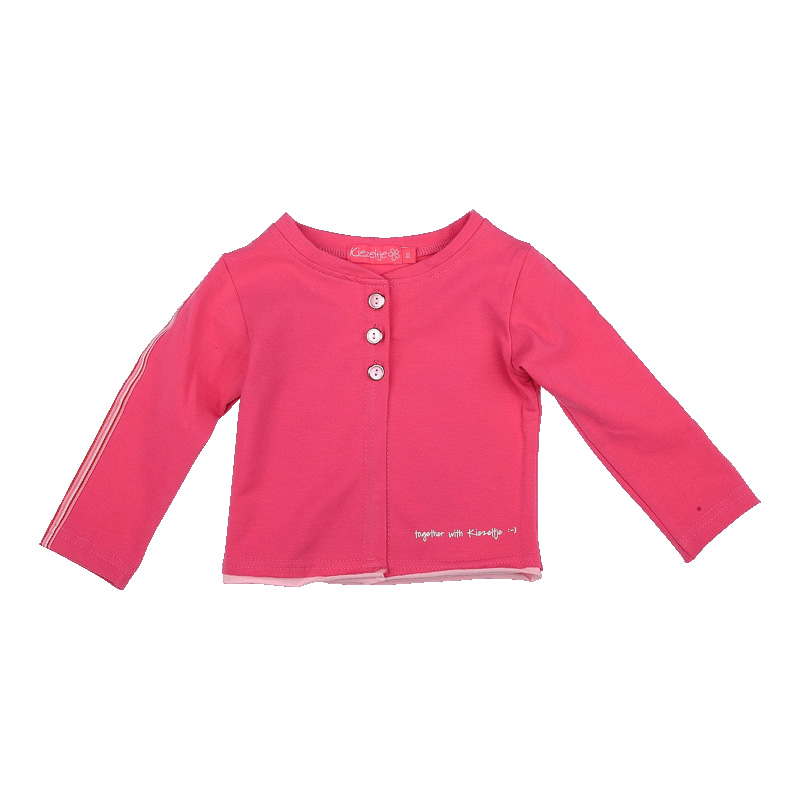 Wunderschöner Cardigan von Kiezel-tje Mini in pink vorne in der oberen Hälfte mit drei wunderschönen Knöpfen zu schließen - ein highlight ist hier die hübsche Streifen-Bordüre auf den langen Ärmeln.