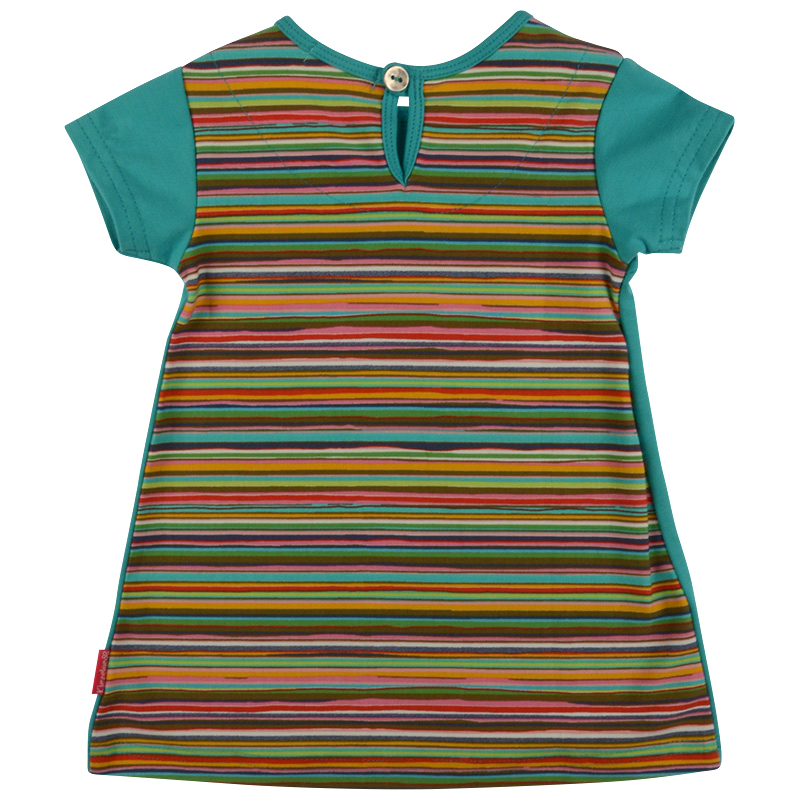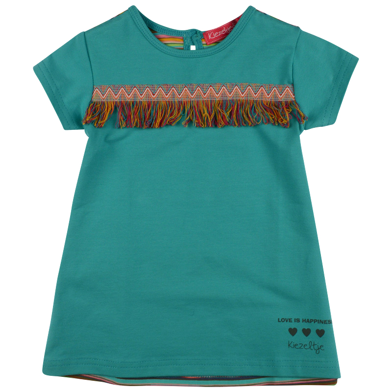 Hübsches Kleid von Kiezel-tje Mini mit vielen Details wie die gestreifte Rückseite, die Bordüre vorne im Brustbereich mit Fransen. Am Rücken/Nacken mit einem Knopf zu schliessen.