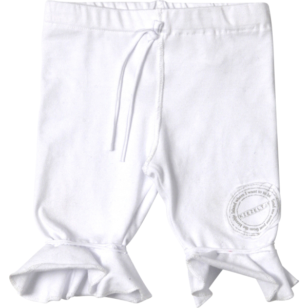 Schöne Legging von Kiezel-tje Mini in weiss mit Gummizug und Zierband am Bund, am Beinabschluss mit Rüschen und einer Logo-Applikation.