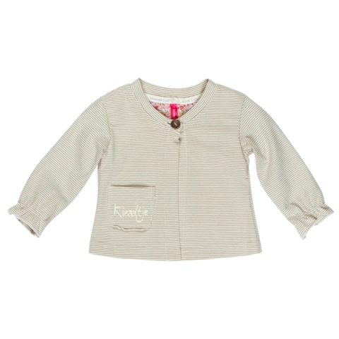 Hübsche Weste von Kiezel-tje Mini in soft grün, Streifen-Optik, vorne eine Tasche mit Logo, ein Knopf zum schließen.