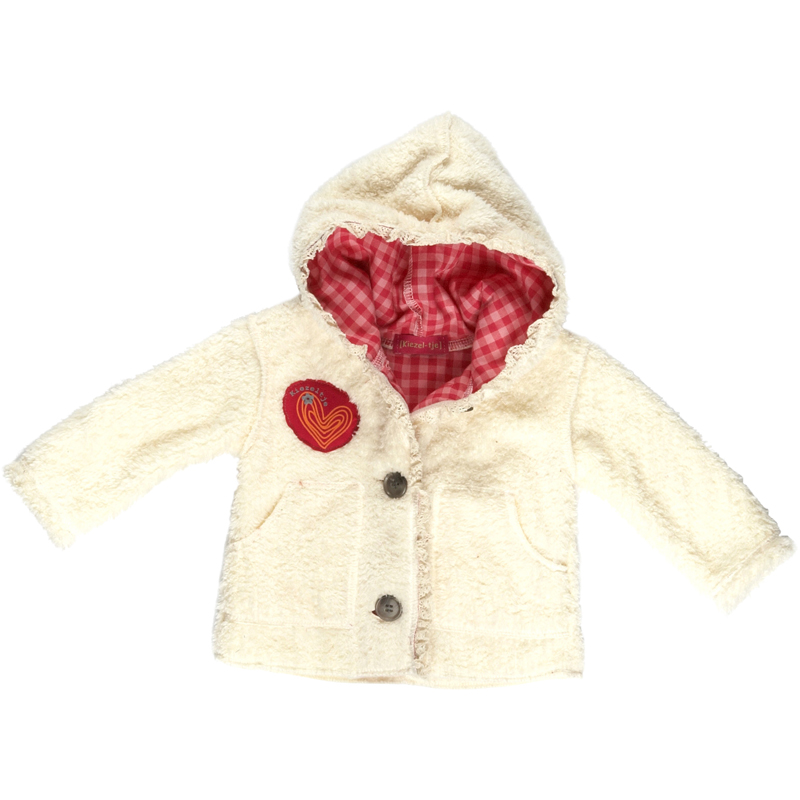 Traumhafte Teddy/Plüsch-Jacke von Kiezel-tje Mini, langarm in off-white, sehr liebevoll im Detail. Z.B. wird dieses Jäckchen vorne mit drei sehr schönen Knöpfen geschlossen, es gibt zwei Front-Taschen und an der Knopfleiste und Kapuze ist es mit Spitze besetzt; die Mütze ist gefüttert. Ein Traum der die Mini Mädels im Winter drunter warm hält!