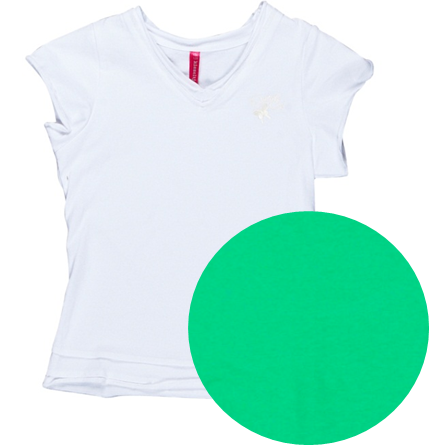 Wahnsinns Basic T-Shirt von Kiezel-tje in grün mit Logo-Stickerei vorne, offene Kanten am V-Ausschnitt, die Ärmel und der Bund sind umsäumt wobei der Bund "mehrlagig" (offen) scheint.