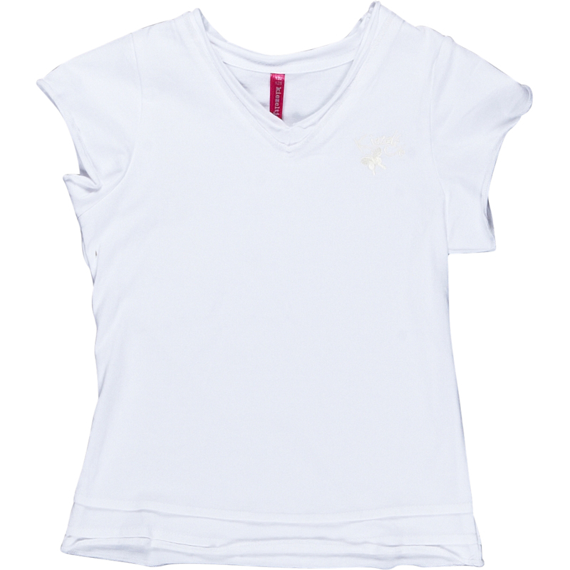 Wahnsinns Basic T-Shirt von Kiezel-tje in offwhite mit Logo-Stickerei vorne, offene Kanten am V-Ausschnitt, die Ärmel und der Bund sind umsäumt wobei der Bund "mehrlagig" (offen) scheint.