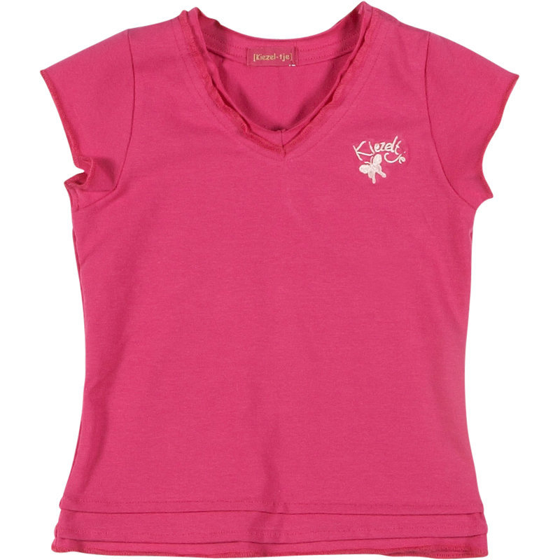 Wahnsinns Basic T-Shirt von Kiezel-tje in pink mit Logo-Stickerei vorne, offene Kanten am V-Ausschnitt, die Ärmel und der Bund sind umsäumt wobei der Bund "mehrlagig" (offen) scheint.
