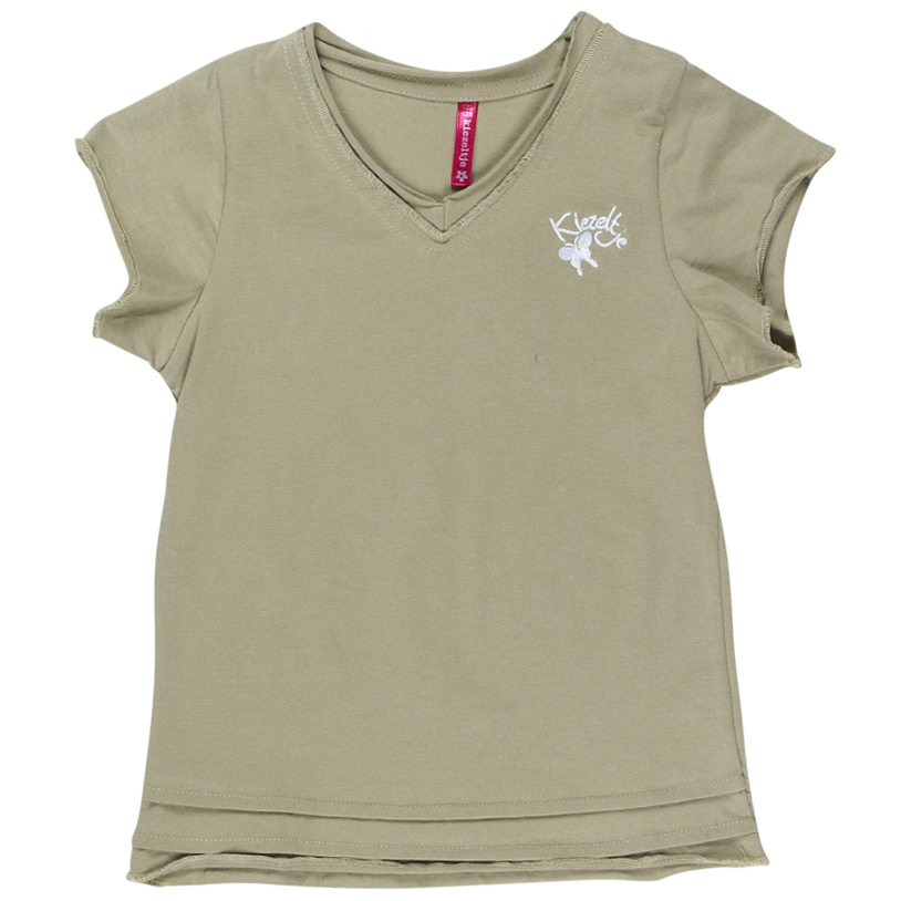 Wahnsinns Basic T-Shirt von Kiezel-tje in soft grün mit Logo-Stickerei vorne, offene Kanten am V-Ausschnitt, die Ärmel und der Bund sind umsäumt wobei der Bund "mehrlagig" (offen) scheint.