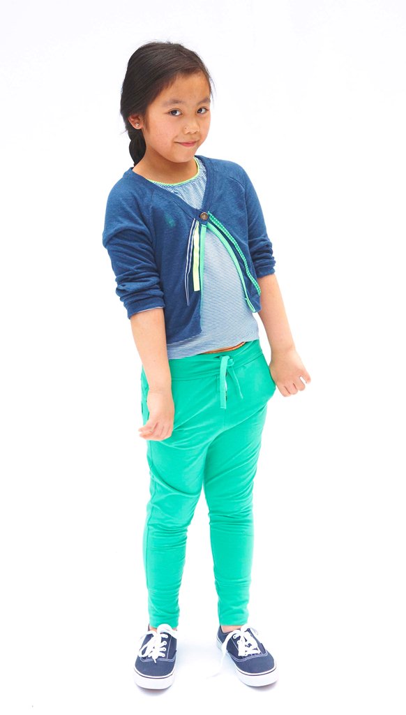 Super Sweat-Chino von Kiezel-tje in grün, vorne zwei Einschub-Taschen, am Popo eine Tasche, der Gummizugbund mit Bindeband sorgt für den idealen Sitz - super zu kombinieren, entweder elegant oder lässig.