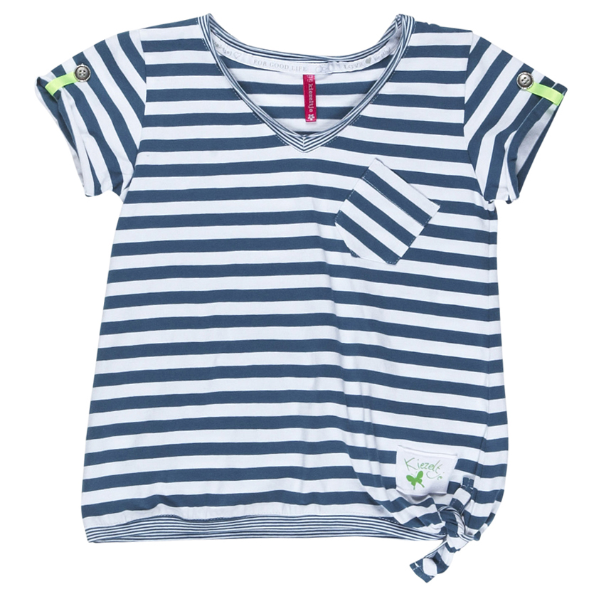 Lässiges T-Shirt von Kiezel-tje mit Blockstreifen, der V-Ausschnitt und der Bund unten werden durch einen fein gestreiften Stoff hervorgehoben; ein eyecatcher sind die Ärmel mit Knopf und Band.