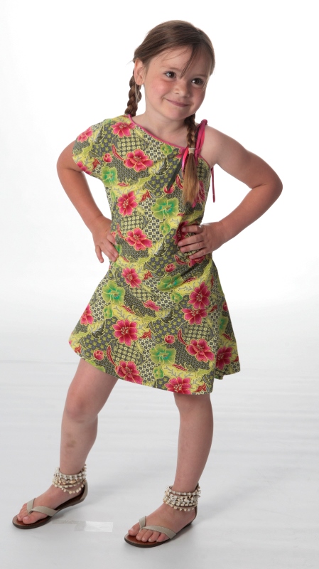 Witziges Kleid von Kiezel-tje mit Blumen-Muster, eine Schulter ist verdeckt und eine wird mit Trägern gehalten, das Oberteil ist enganliegend und der Rockteil ist in A-Form und asymmetrisch. Perfekt mit Legging oder solo oder mit einem Langarm-Shirt drunter zu tragen.