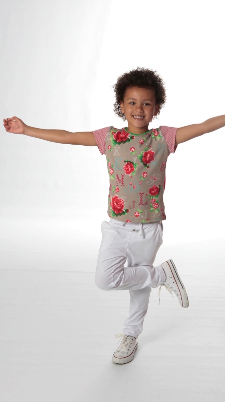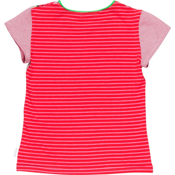 Wundervolles T-Shirt von Kiezel-tje in den Farben rot/pink, mit Muster-Mix: die Ärmel sind karriert, die Front geblümt und der Rücken in rot.