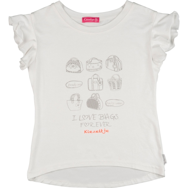 Schönes T-Shirt von Kiezel-tje in offwhite mit feinem Taschen-Print vorne und wunderschönen leicht gerüschten Ärmeln.
