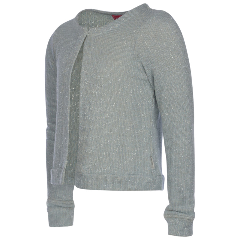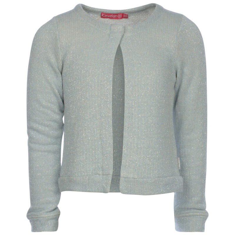 Wunderschöner glamouröser Cardigan von Kiezel-tje in einem Silbergrau, mit Glitzerfaden durchzogen. Der Cardigan wir vorne mit einem Knopf geschlossen.