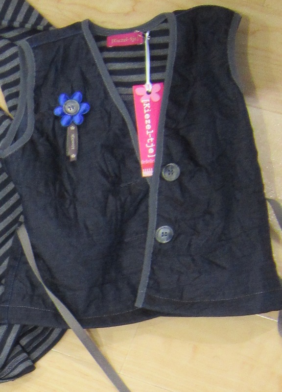 Lässige Weste von Kiezel-tje in navy im Mustermix, vorne mit zwei Köpfen zu schliessen, das Kiezel-Logo-Patch in Form einer Blume vorne rechts und das Bindeband um die Taille machen den Look dieser Weste perfekt.
