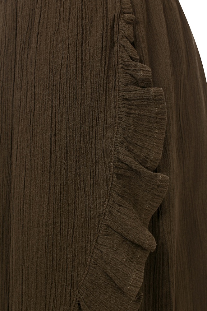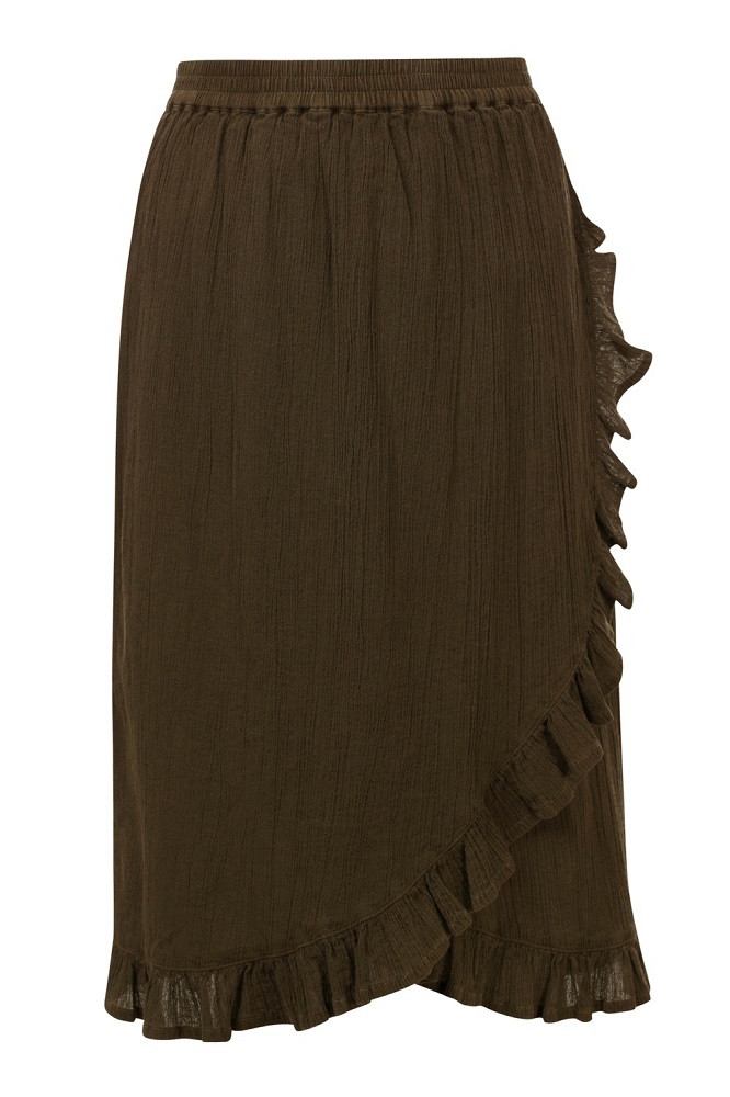 Ein Maxirock oder Kleid sollte dieses Jahr in der Sommergarderobe Ihres Kindes nicht fehlen. Dieser lange Rock in Wickeloptik hat eine dunkle khaki-Farbe und eine schöne Crinkle-Baumwollqualität und einen Gummizugbund.