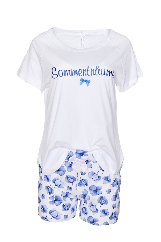 Bring den Sommer zu dir: Dieses Short-Set und macht gute Laune! Das T-Shirt Oberteil in weiß mit blauer Sommerträume-Schrift, die Shorts mit blauen Bumen allover.
