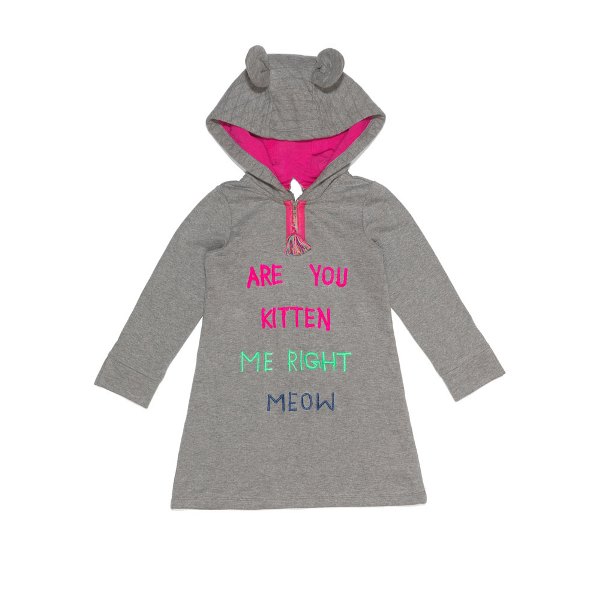 Bezauberndes Kapuzen-Kleid von Mim-Pi in grau mit witzigem Katzenohren an der Kapuze, vorne mit großer Schrift-Stickerei in pink grün und blau, die Ärmel sind an den Bündchen mit Schlitz, leichte A-linie, vorne am Ausschnitt mit Reißverschluss.