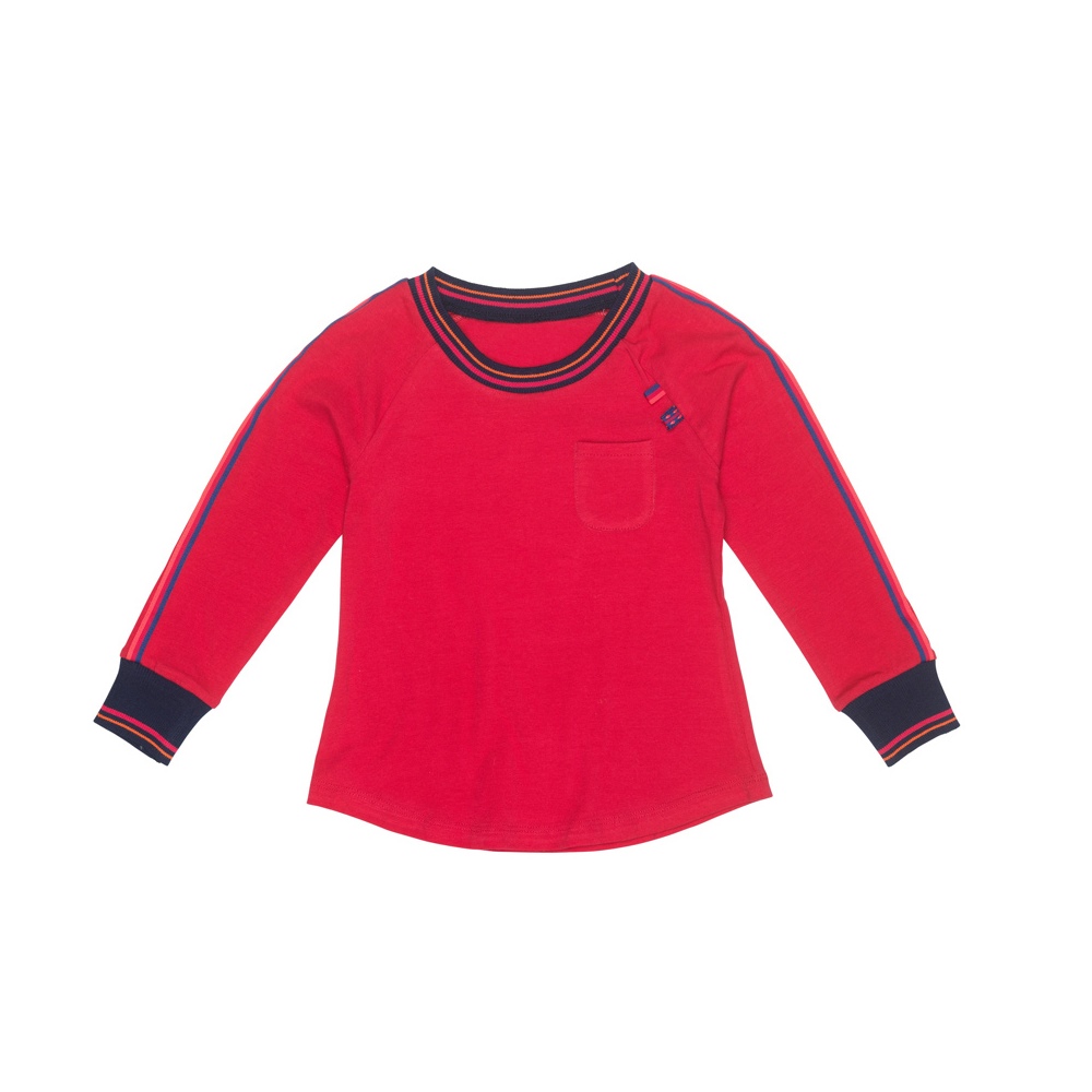Hübsches Langarm-Shirt/Longsleeve von Mim-Pi in pink mit tollen Bündchen an Ausschnitt und Ärmeln und einer blauen Bordure von der Schulter bis zum Ärmelbund.