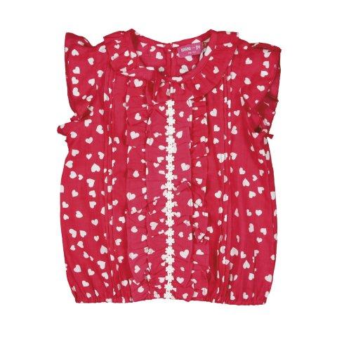 Traumhafte Bluse/Shirt von Mim-Pi mit Herz-Print in rot, mit liebevollen Details wie Rüschen vorne und am Halsausschnitt Spitzenborte an den weiten kurzen Ärmeln und am Ausschnitt. Außerdem ein perfekter Sitz durch den Gummizug am Bund.