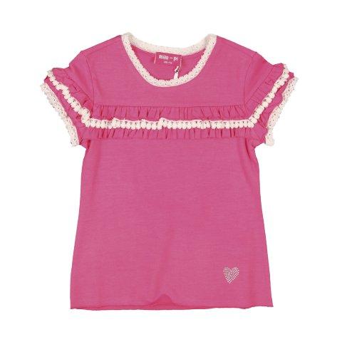 Zauberhaftes T-Shirt von Mim-Pi in pink, mit weisser Spitzeneinfassung am Halsausschnitt und an den Armen, eine Rüschen und Spitzereihe ziert die Vorderseite, einfach ein Traum.