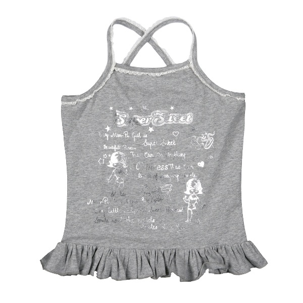 Supersüßes Top von Mim-Pi in grau melange, Träger hinten über Kreuz, mit Print vorne und als Saumabschluss Rüschen.