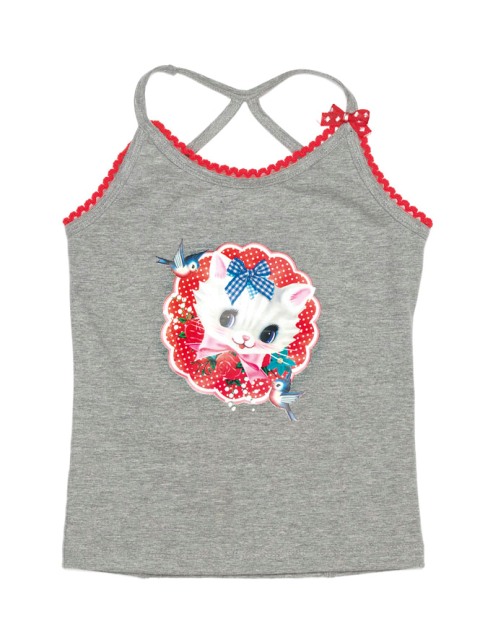 Sehr schönes Spagetti-Top von Mim-pi in grau mit großem Katzen-Print vorne, gekreuzte Träger am Rücken, Mäusezähnchenspitze in rot.