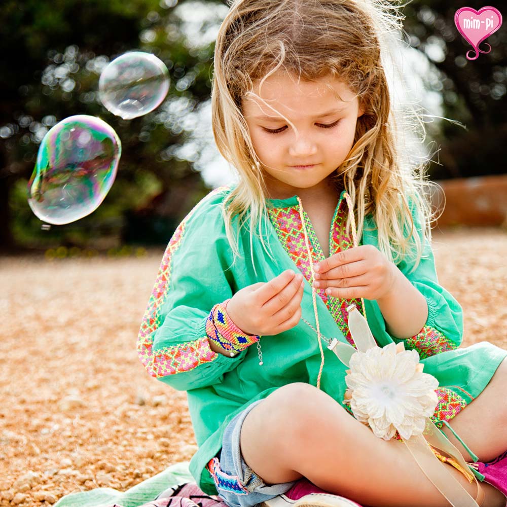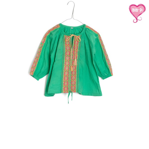 Reizende Bluse in grün von Mim-Pi im Hippy-Look. Halsausschnitt und Saumende mit Tunnelzug, Ärmelabschluss mit Gummizug, reizende Stickborten vorne und an den Ärmeln. Luftig leichte Baumwolle - auch für heiße Sommertage.