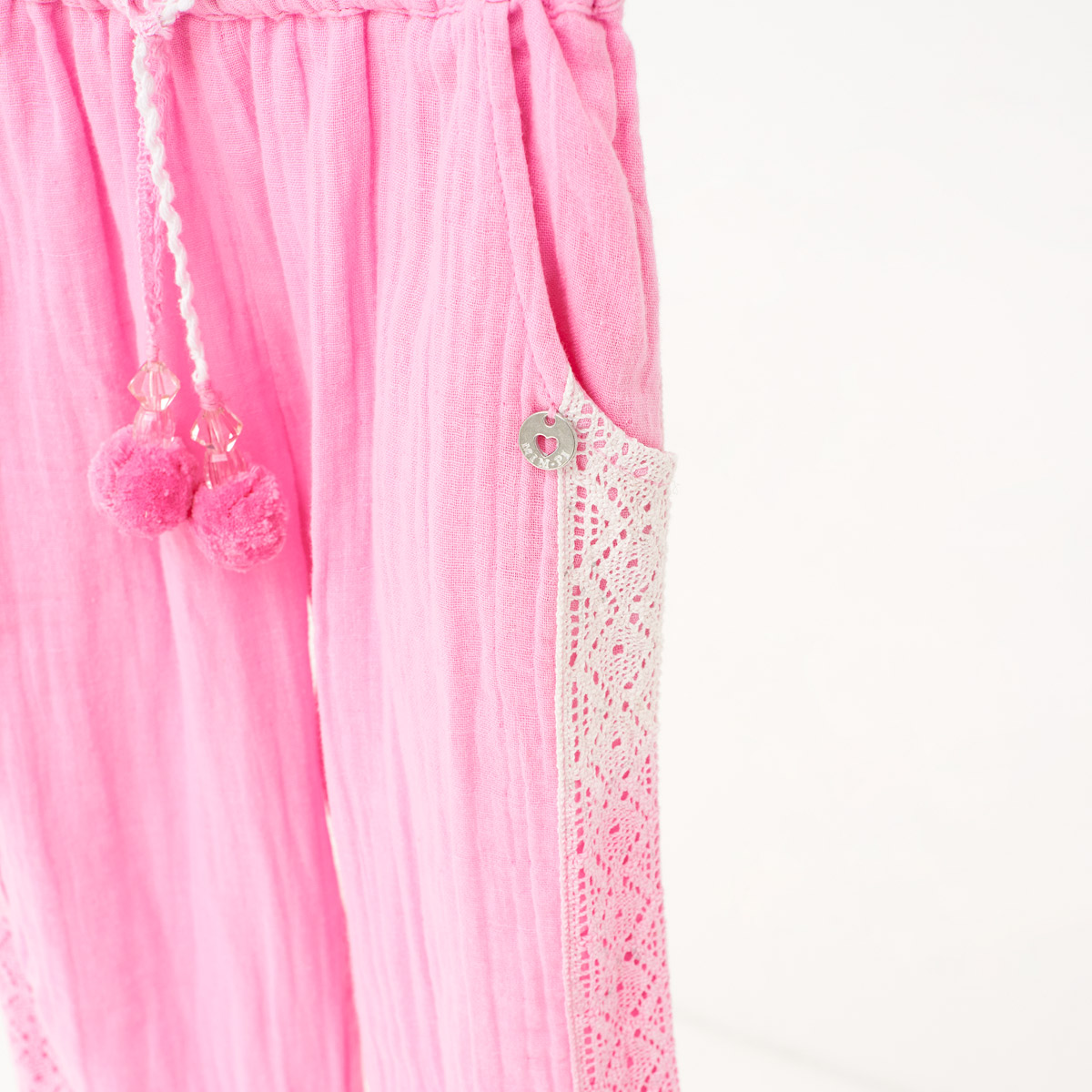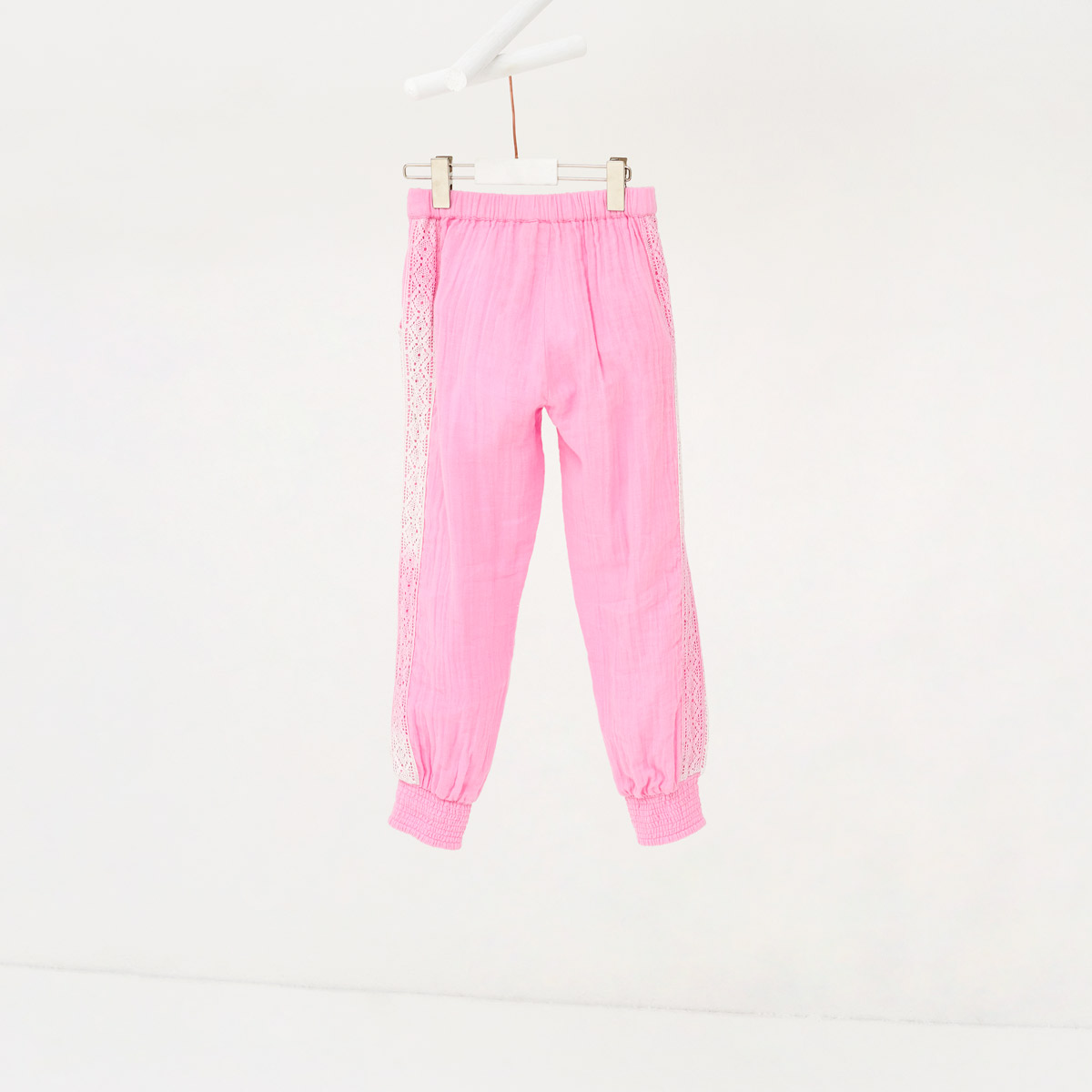 Bequeme, rosafarbene Hose mit Gummizugbund, seitlichen Eingriff-Taschen und gesmokten Bündchen an den Beinenden. Seitlich am Bein verziert durch Spitze. Pflegeleichtes Material aus leichtem Baumwoll-Musselin in Crinkeloptik, locker gewebt und bügelfrei.