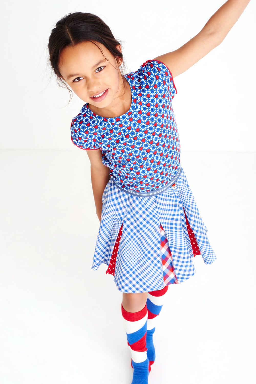 Leichtes Sommerkleid mit toller Passform und mit einem Muster aus rot-weiß-blauen Blumen und Herzchen. Die Taille ist elastisch geschmückt mit einer kleinen Rose und einer Mim-Pi-Logo-Münze. Der weitschwingende Rockteil ist aus Webware mit mehreren eingesetzten Stoffteilen aus der blau-weiß-roten Serie.